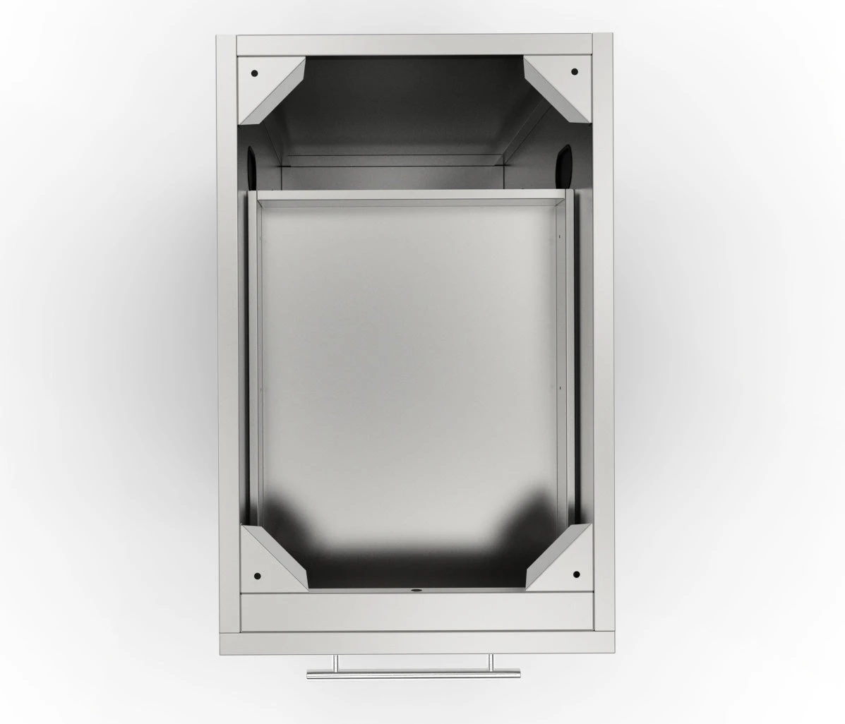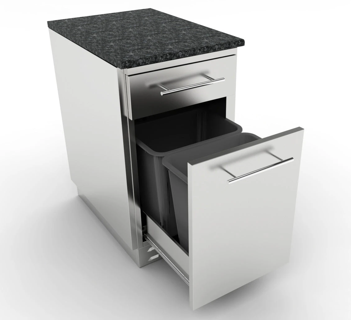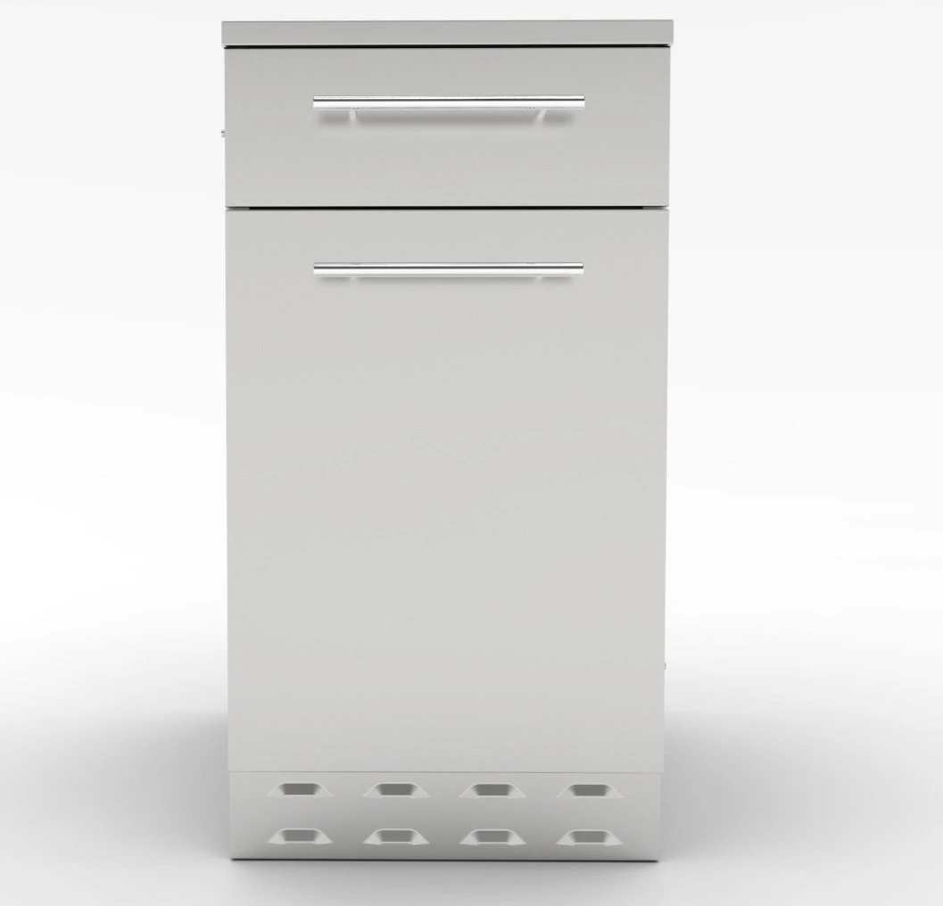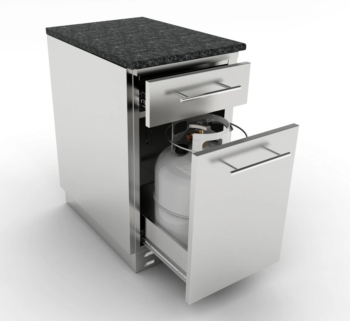 The Sunstone 18 In. propane tank drawer storage combo, is ideal as a multi-purpose cabinet, with the option for inserting a propane tank with correct gas venting through front kick plate vents or optionally purchase up to two trash bins and place them front to back, use one as waste and other for recyclables. Or adjust trash ring to its up position and add a loose trash bag, or even insert a plastic trash bin.