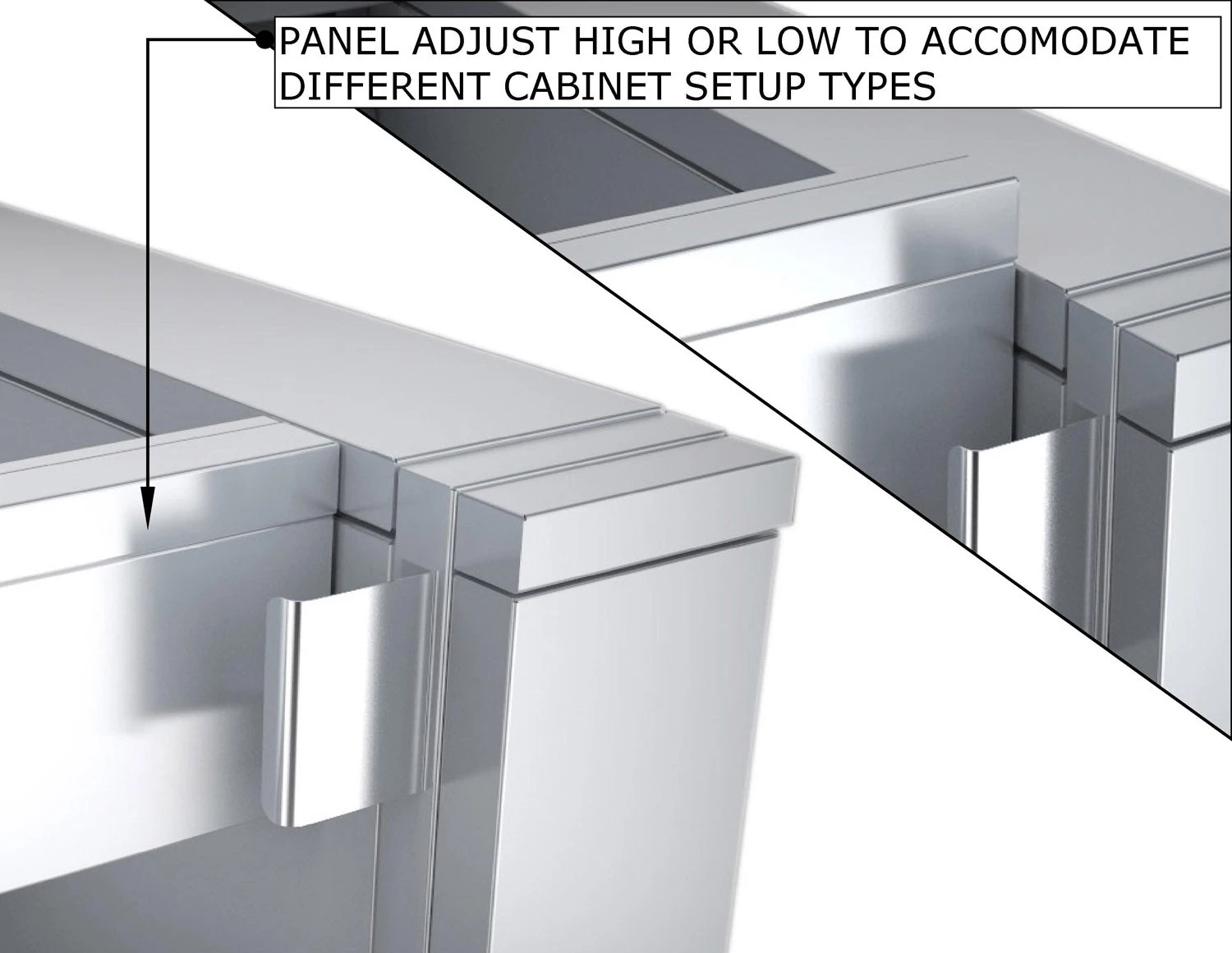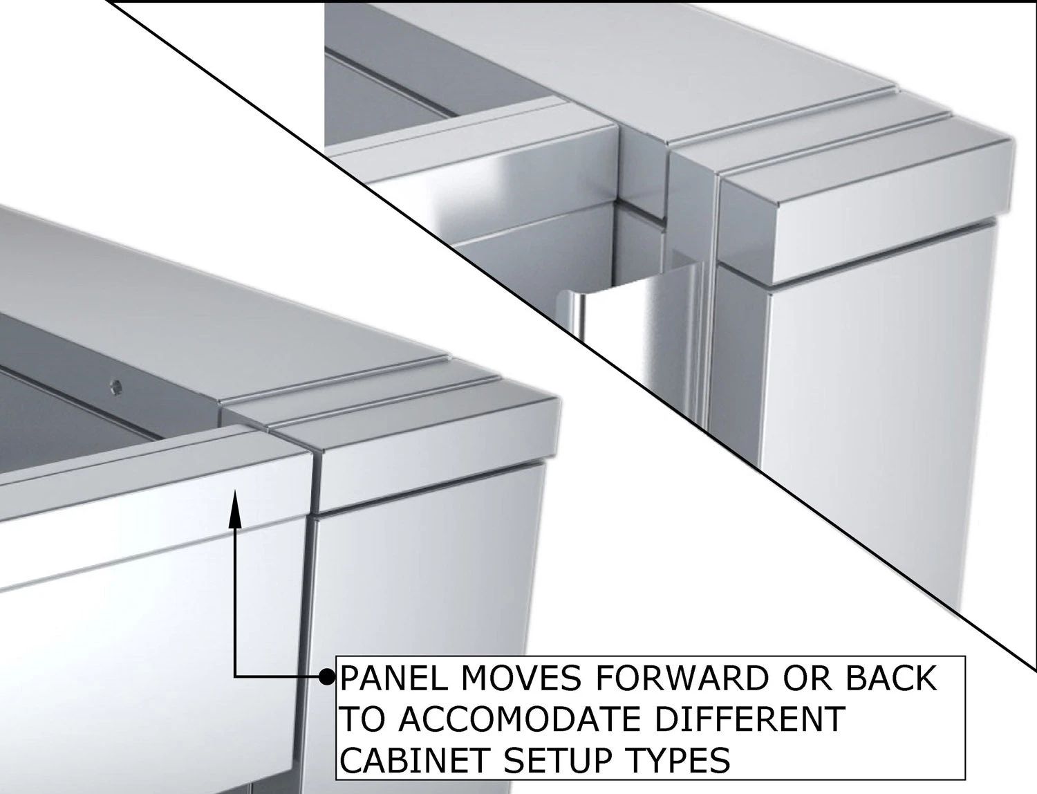 For full-bull nose counters – simply remove each of the cabinets counter-rail seen as the top horizontal column, and overlap counter over front edge making for some elegant added features. The cabinet comes completely setup, only fasten door handle, hand-screw each adjustable leg in place, and snap on the front and back kick-plates.