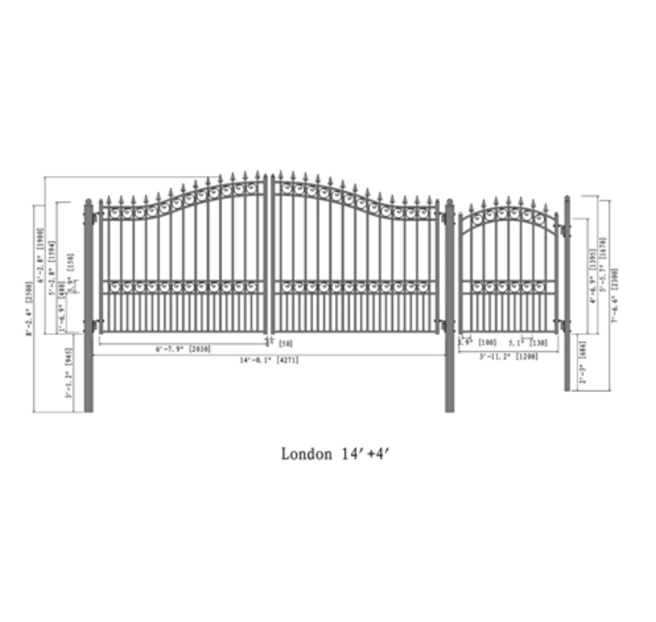 ALEKO’s London Style Steel Gate Combo Set includes our famous 14 Foot London Dual Swing Driveway Gate with a matching Pedestrian Gate.
