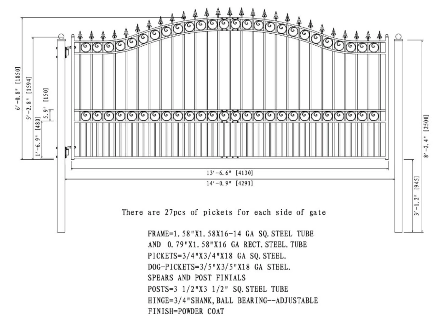 - Gates are constructed with heavy duty galvanized steel and feature a powder paint coating to preserve the gate’s timeless beauty.
