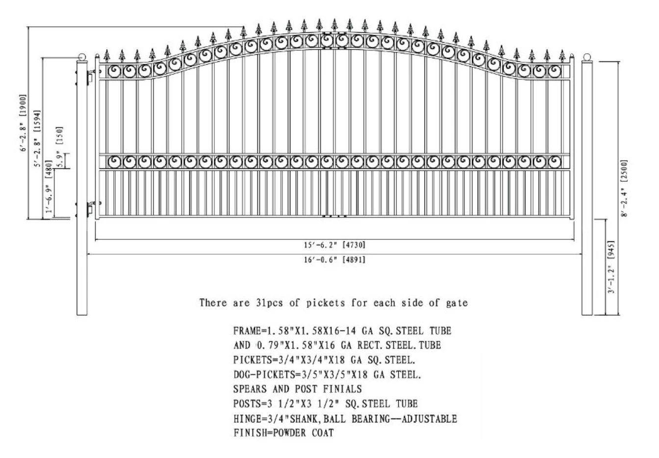 - Gates are constructed with heavy duty galvanized steel and feature a powder paint coating to preserve the gate’s timeless beauty.