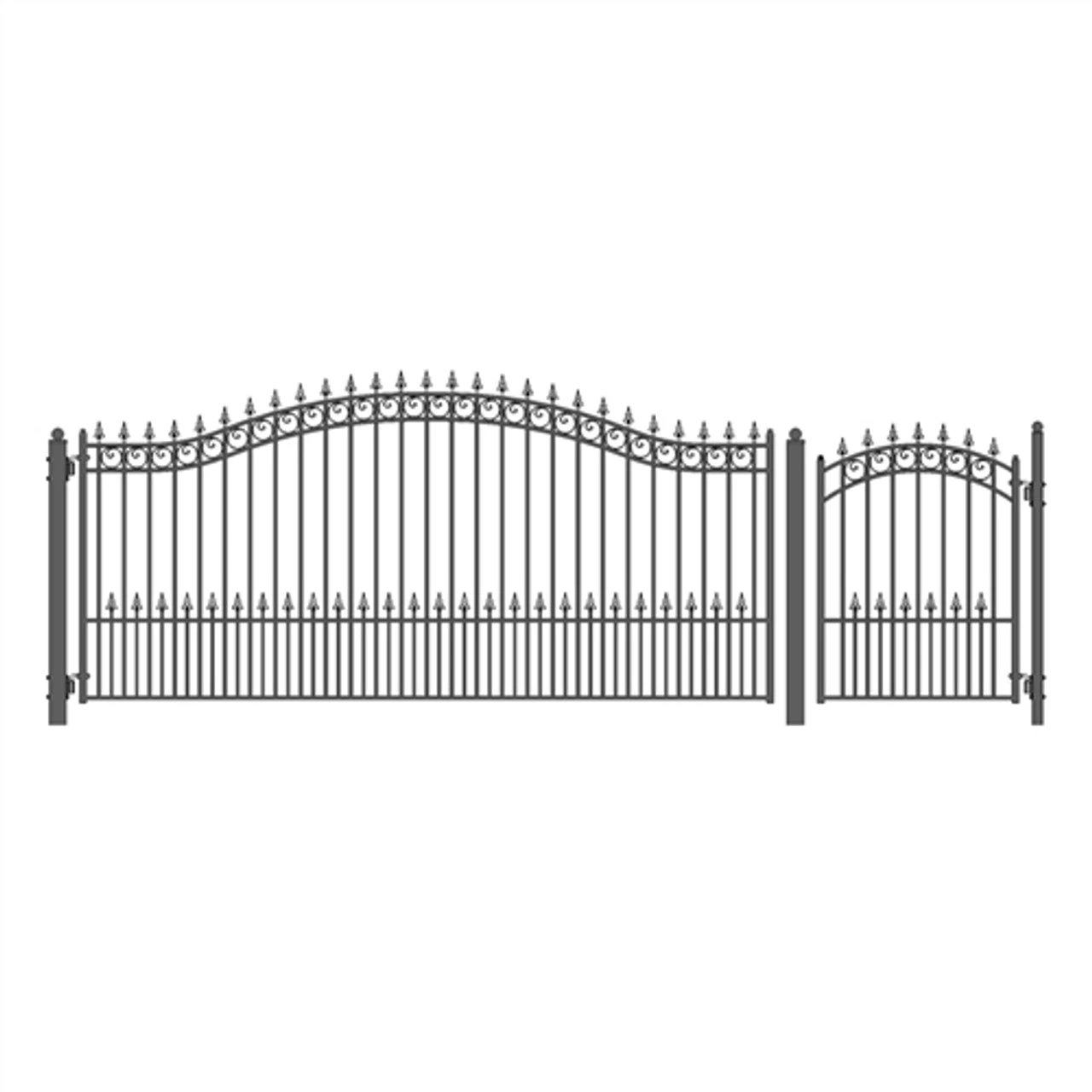 ALEKO’s Prague Style Steel Gate Combo Set includes our famous 14 Foot Prague Single Swing Driveway Gate with a matching Pedestrian Gate.