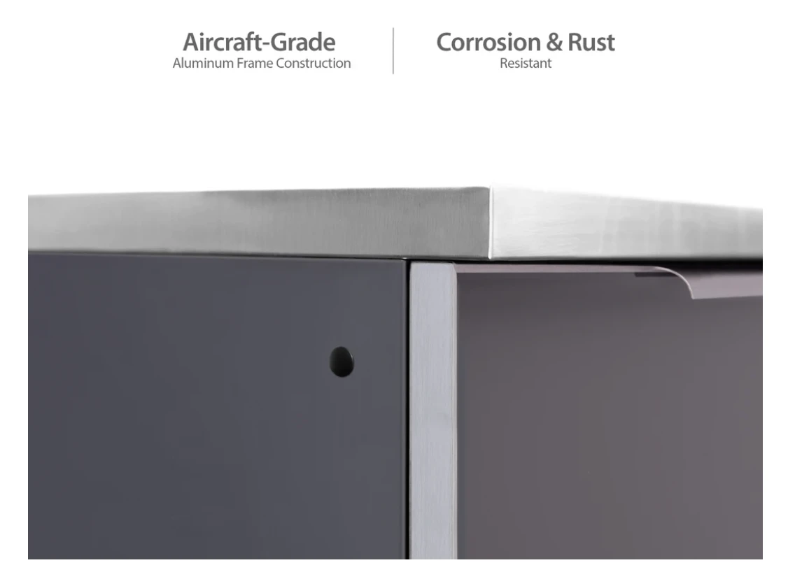 - Pre-Assembled Outdoor Kitchen Cabinets constructed from aircraft-grade Aluminum cabinet frames & modern tempered glass doors