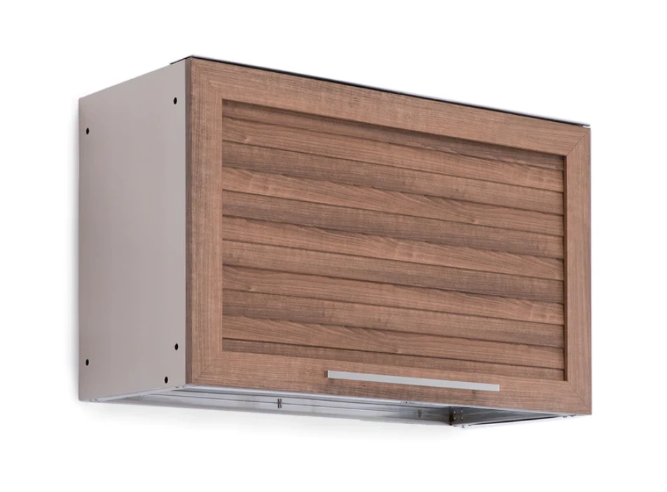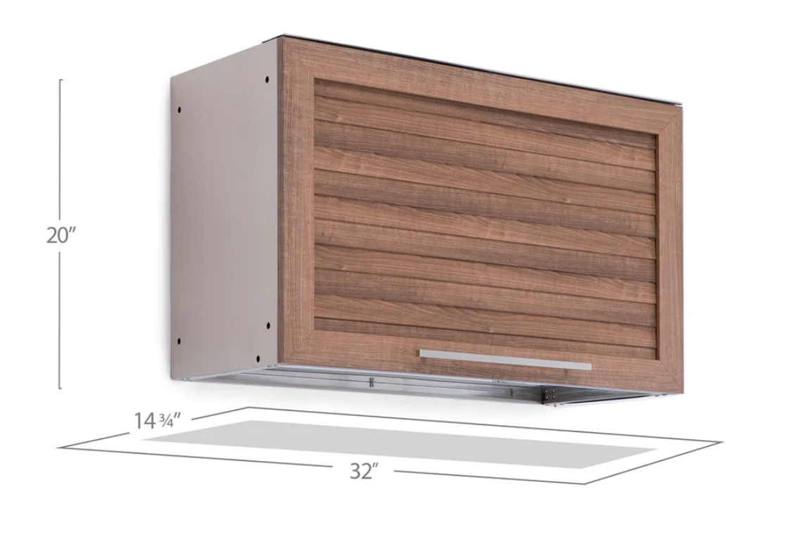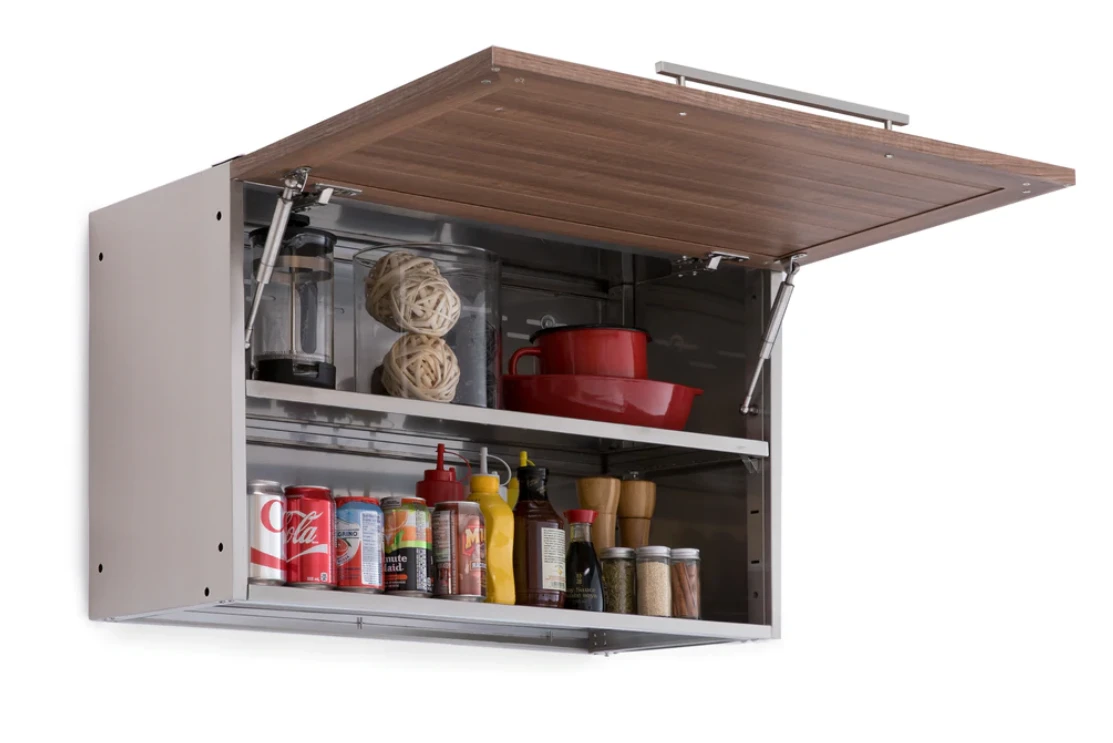 - Make use of your vertical storage space with the Outdoor Kitchen Wall Cabinet. This cabinet offers added organizational room above your work area, and features a 1 in. adjustable shelf, for storing your quick grab items and hosting supplies.