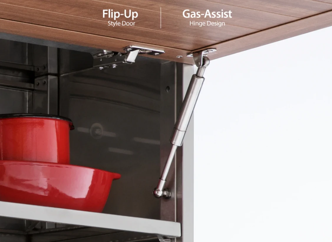 - The Wall Cabinet can be installed securely to wood walls, brick or masonry (brick and masonry hardware not included), using the perforated back panels. The flip-up style door with gas-assist hinges provide easy-access to your stored belongings, while keeping items out of the reach of children.