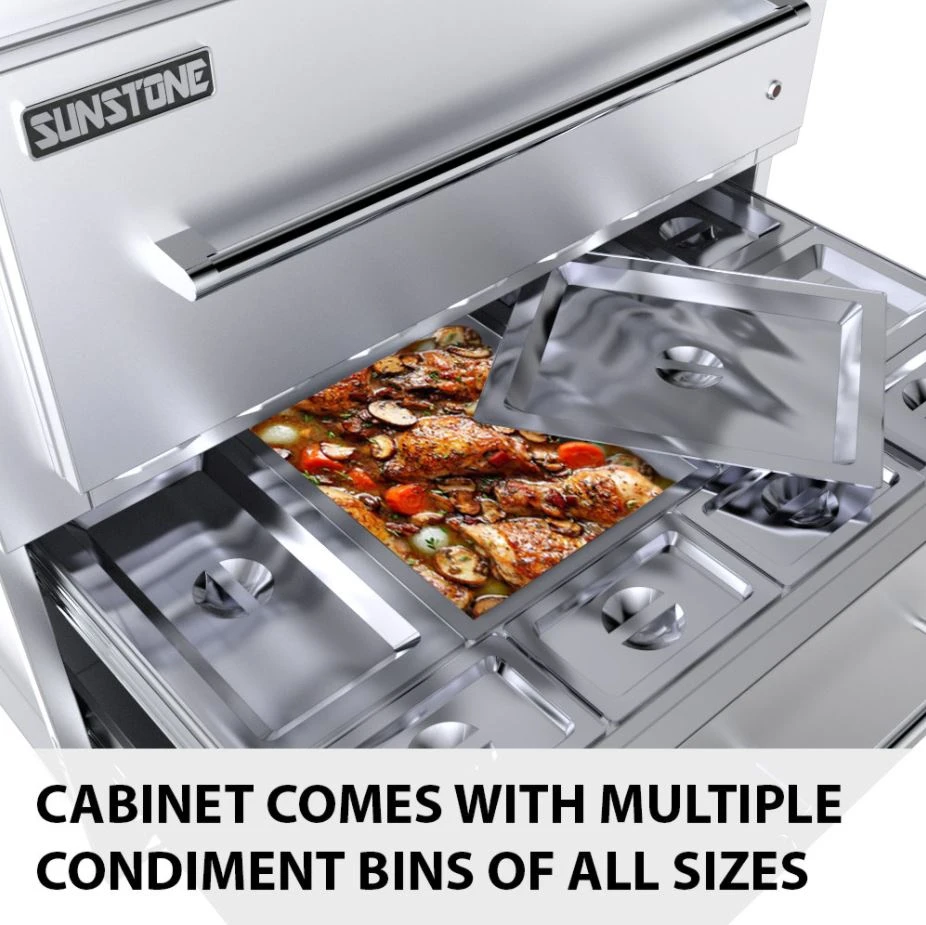 - The cabinet comes with a large bottom drawer with plenty of bonus storage space and a large condiment bin drawer you can swap bins in and out with warming drawer.