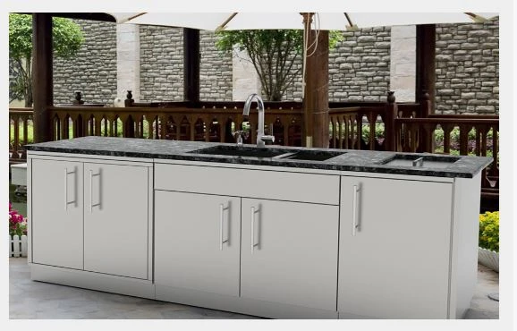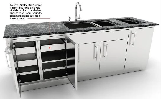 It has a large Pantry Cabinet with multiple shelves and large roll out bins for all your dry good and dishes protected from the weather in a weather sealed 30” inch cabinet.
