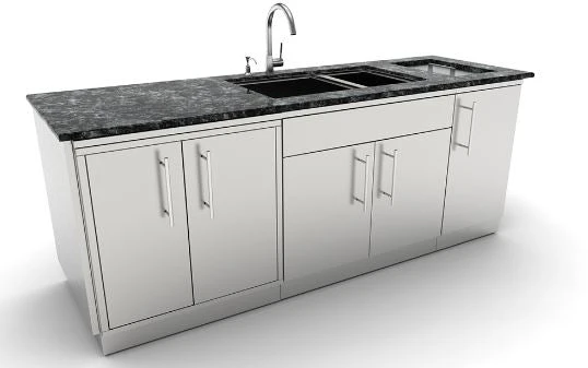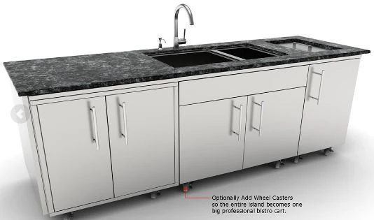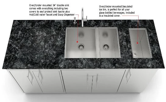 In the center is a 34” inch Double Sink with Hot/Cold faucet, and removable covers to keep out debris, resting in a 36” inch base cabinet with tons of extra storage room to boost.